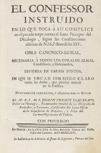 .1756.. LIBRO: .(RELIGIÓN).. .DIAZ BRAVO, JOSEPH VICENTE:. .EL CONFESSOR INSTRUIDO EN LO QUE TOCA A SU COMPLICA EN EL PECADO TORPE CONTRA EL FEXTO PRECEPTO DEL DECALOGO, SEGUN LAS CONSTITUCIONES ULTIMAS DE N. SS. O. BENEDICTO XIV.. Madrid: Oficina...