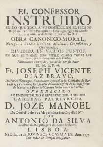 .1757.. LIBRO: .(RELIGIÓN).. .DIAZ BRAVO, JOSEPH VICENTE:. .EL CONFESSOR INSTRUIDO EN LO QUE TOCA A´ SU COMPLICE EN EL PECADO TORPE CONTRA EL SEXTO PRECEPTO del decalogo, segun las constituciones ultimas de N. SS. P. Benedicto XIV.. Lisboa:...