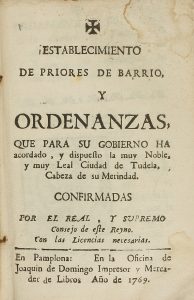 .1769.. LIBRO: .(DERECHO).. .ESTABLECIMIENTO DE PRIORES DE BARRIO Y ORDENANZAS QUE PARA SU GOBIERNO HA ACORDADO, Y DISPUESTO LA MUY NOBLE, Y MUY LEAL CIUDAD DE TUDELA, CABEZA DE SU MERINDAD.. Pamplona: Imp. de Joaquin de Domingo, 1769. 8º menor. 48...