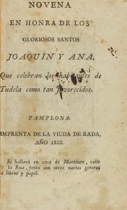 .1822.. LIBRO: .(RELIGIÓN).. .NOVENA EN HONRA DE LOS GLORIOSOS SANTOS JOAQUIN Y ANA QUE CELEBRAN LOS HABITANTES DE TUDELA COMO TAN FAVORECIDOS.. Pamplona: Imp. Viuda de Rada, 1822. 8º menor. 30 p. [Sigue:] .NOVENA AL ESPAÑOL SAN ROQUE ABOGADO...