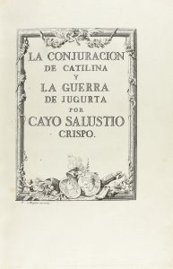.1772.. LIBRO: .(CLÁSICOS).. .SALUSTIO CRISPO, CAYO:. .LA CONJURACION DE CATILINA Y LA GUERRA DE JUGURTA POR.... Madrid: Imp. Joachin Ibarra, 1772. Folio. 12 h. (incluido retrato de Salustio y grabado) + 395 p. Texto bilingüe latino-castellano,...