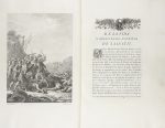 según traducción atribuida al Infante Gabriel Antonio, hijo de Carlos III, y revisada por Pérez Bayer. Incorpora abundantes notas y un epílogo de Pérez Bayer acerca del idioma de los fenicios, más el índice. Portada, retrato del autor, mapa, 8 láminas, 32 viñetas, capitulares e ilustraciones en texto grabadas al cobre por los más acreditados artistas de la época: Manuel Montfort, Fernando Selma, Joaquín Fabregat, Manuel Salvador Carmona, Joaquín Ballester, Juan de la Cruz, Jerónimo Antonio Gil, Francisco Assensio, Francisco Muntaner y Juan Antonio Salvador Carmona, quienes, bien por dibujos propios o por los de Mariano Salvador Maella o Isidro Carnicero, ilustraron el libro que mayor fama ha dado a la imprenta española. Esta fama se debe no tan solo a la calidad de los artistas que en ella participaron, sino también a la calidad de la impresión: amplios márgenes, un papel de gran calidad, la belleza de los tipos fundidos por Antonio Espinosa, una cuidada composición y una gran limpieza en la impresión y estampación de las láminas. Encuadernación en plena piel con tejuelo, y ruedas doradas, nervios, lomera cuajada, presentado en una caja de papel al agua con perfiles de piel.