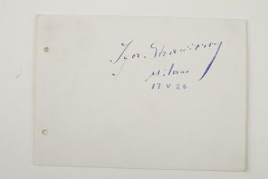 Belle et grande signature à l’encre bleue avec la date : « Igor Strawinsky Milano 17 V 26 » (pour l’album de la claveciniste italienne Corradina Mola).