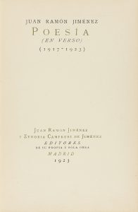.1923.. LIBRO: .(LITERATURA-MODERNISMO).. .JIMENEZ, JUAN RAMÓN:. .POESIA (EN VERSO) (1917-1923).. Madrid: Juan Ramón Jiménez y Zenobia Camprubí de Jiménez editores de su propia y sóla obra, 1923. 8º mayor. 124 p. + 2 h. Tela editorial,...
