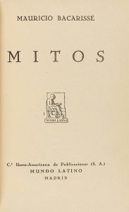 .1930 ca.. LIBRO: .(LITERATURA-VANGUARDIAS).. .BACARISSÉ, MAURICIO:. .MITOS.. Madrid: Mundo Latino, s. a. 8º menor. 184 p. + 2 h. PRIMERA EDICIÓN. Buen ejemplar. Enc. en media piel y puntas mínimamente rozada; conserva las cubiertas originales.