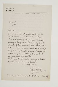 Edgar VARÈSE (1883-1965). 3 L.A.S. et 1 L.S., New York 1955-1960, à Michel Tapié ; 4 pages et demie la plupart in-4, 2 à son en-tête, une enveloppe et 2 adresses.