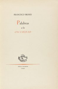 .1966.. LIBRO: .(LITERATURA-POSGUERRA).. .BRINES, FRANCISCO:. .PALABRAS A LA OSCURIDAD.. Madrid: Ínsula, 1966. 4º menor. 173 p. PRIMERA EDICIÓN. Pulida enc. en media piel y puntas con papel al agua hecho a mano, hieros en ambos planos; conserva la...