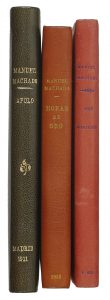 Devocionario poético. .Valladolid: Ed. Reconquista, 1938. Id. 175 p. [Más:] .ARS MORIENDI.. Madrid: Ed. Mundo Latino, 1921. Id. 98 p. + 2 h. Las 3 obras son PRIMERAS EDICIONES. Enc. en plena piel.
