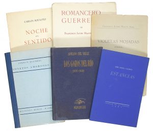.NOCHE DEL SENTIDO. (1957) de Carlos Bousoño;. VIOLETAS MOJADAS Y ROMANCERO GUERRERO. (1936) de Francisco Javier Martín Abril, estos dos últimos con dedicatoria autógrafa; Diversas enc., algunas PRIMERAS EDICIONES.