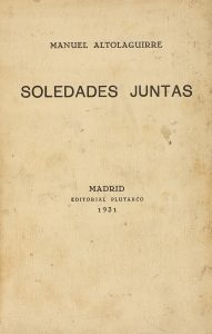 .1931.. LIBRO: .(LITERATURA-GENERACIÓN 27).. .ALTOLAGUIRRE, MANUEL:.. .SOLEDADES JUNTAS.. Madrid: Plutarco, 1931. 8º mayor. 154 p. + 3 h. Restauración marginal en la p. 127 y subrayado en lápiz de color en la p. 77. PRIMERA EDICIÓN. Enc. en...