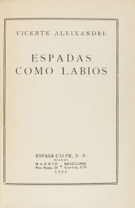 .1932.. LIBRO: .(LITERATURA-GENERACIÓN 27).. .ALEIXANDRE, VICENTE:. .ESPADAS COMO LABIOS.. Madrid: Espasa Calpe, 1932. 8º mayor. 106 p. PRIMERA EDICIÓN. Pulida enc. en plena piel con hilos dorados en ambos planos, nervios, guardas al agua pintadas...
