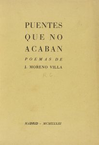 .1933.. LIBRO: .(LITERATURA-GENERACIÓN 27).. .MORENO VILLA, J.:. .PUENTES QUE NO ACABAN. POEMAS DE.... Madrid: Imp. de Concha Mendez y Manuel Altolaguirre, 1933. 8º menor. 58 p. + 2 h. PRIMERA EDICIÓN. Enc. en media piel y tela, nervios, tejuelo....