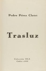 .1933.. LIBRO: .(LITERATURA-GENERACIÓN 27).. .PÉREZ CLOTET, PEDRO:. .TRASLUZ.. Cádiz: Imp. de Salvador Repeto, Colección Isla, 1933. 8º. 127 p. + 2 h. Retrato fotográfico del autor. Enc. en media piel y papel al agua pintado, tejuelo y nervios....