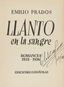 .1937 ca.. LIBRO: .(LITERATURA-GENERACIÓN 27).. .PRADOS, EMILIO:. .LLANTO EN LA SANGRE. ROMANCES (1933-1936).. Valencia: Imp. de la Semana Gráfica/Eds. Española, s.a. 8º. 109 p. + 1 h. Dibujos de Miguel Prieto. PRIMERA EDICIÓN. En rústica...
