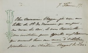 7 janvier 1877. Elle lui transmet, au nom du Roi de Hollande, une invitation pour assister aux examens d’octobre prochain au château royal du Loo : « Vous voyez bien que vous êtes rentré dans les bonnes grâces de sa Majesté et que si vous n’êtes pas le plus heureux des mortels, ce ne sera pas sa faute »… 5 janvier [1884]. Elle avait espéré pouvoir assister à la première représentation de Sigurd, « mais je ne me sens pas encore en état de voir du monde et de suivre un ouvrage qui m’intéresserait, avec attention ». Elle est allée dimanche au concert du Conservatoire : « Je n’ai fait que pleurer tout le temps au point qu’il m’a fallu quitter ma loge et m’en aller ». Elle lui souhaite un vif succès et espère qu’il lui rendra visite à son retour : « Vous ferez par là un grand plaisir à une pauvre femme bien triste » [après la mort de Louis Viardot et d’Ivan Tourgueniev (5 mai et 3 septembre 1883)]…