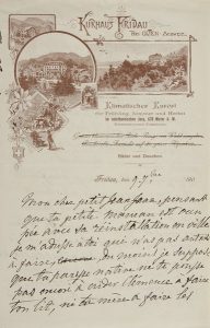 Pauline Viardot. L.A.S. « PV », Fridau 9 septembre [1900], à son arrière-petit-fils Jean Omer-Decugis ; 4 pages in-8 à en-tête et vignette illustrée du Kurhaus Fridau.