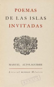 .1944.. LIBRO: .(LITERATURA-POSGUERRA).. .ALTOLAGUIRRE, MANUEL:.. .POEMAS DE LAS ISLAS INVITADAS. Prólogo de Juan Ramón Jiménez.. México: Manuel Altolaguirre, 1944. 8º menor. 162 p. + 2 h. PRIMERA EDICION. Enc. en rústica original a dos tintas,...