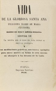 .1856.. LIBRO: .(NAVARRA-RELIGIÓN).. .VIDA DE LA GLORIOSA SANTA ANA FELICISIMA MADRE DE MARIA SANTÍSIMA MADRE DE DIOS Y SEÑORA NUESTRA.... Tudela: Imp. Tudelana, 1856. 8º. 208 p. Enc. en plena piel, nervios, conserva las cubiertas originales....