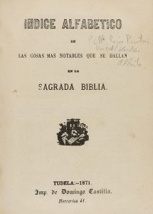 .1871.. LIBRO: .(NAVARRA-RELIGIÓN).. .INDICE ALFABETICO DE LAS COSAS MAS NOTABLES QUE SE HALLAN EN LA SAGRADA BIBLIA.. Tudela: Imp. Domingo Castilla, 1871. 8º. 75 p. Enc. reciente en media piel, puntas, nervios. Palu 119032.