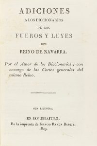 .1829.. LIBRO: .(NAVARRA-DERECHO).. .[YANGUAS Y MIRANDA, JOSÉ:].. .ADICIONES A LOS DICCIONARIOS DE LOS FUEROS Y LEYES DEL REINO DE NAVARRA.. San Sebastian: Imp. Ignacio Ramon Baroja, 1829. 8º mayor. 3 h. + 114 p. + 2 h. Algún punto de óxido. Enc....