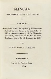 .1846.. LIBRO: .(NAVARRA-DERECHO).. .YANGUAS Y MIRANDA, JOSÉ:. .MANUAL PARA GOBIERNO DE LOS AYUNTAMIENTOS DE NAVARRA. COMPRENDE TODOS LOS NEGOCIOS Y DISPOSICIONES.... Pamplona: Imp. Francisco Erasun, 1846. 8 mayor. 83 p. + 1 h. Enc. en piel,...