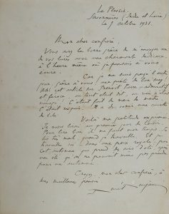 Paris, 6 janvier 1925, à F. Grenier à Angoulême : « Bravo pour Balzac ! Il méritait bien qu’on le choisît à Angoulême, ce grand homme. Il a adoré votre ville »… Le Plessis Savonnières 7 octobre 1931, à un confrère : « je me suis payé l’autre jour, grâce à vous, une pinte de bon sang ! Ah ! Cet article sur Benoît Pierre, admiratif et féroce, où tout était dit, où rien n’était ménagé ! C’était fait de main de maître. C’était exquis. Il a dû vomir une cuvette de bile »… Paris 29 janvier 1937, pour un rendez-vous : « Vous seul saurez agir avec pertinence »… Paris 11 juillet 1937, protestant contre la malhonnêteté de la S.I.F.R.A., qui a perdu son dialogue, et lui reproche de ne pas avoir réclamé assez tôt ce qu’on lui devait pour son travail perdu, « alors que nous réclamons aux uns puis aux autres depuis six mois »…