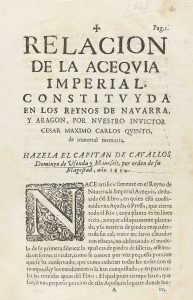 .1654.. FOLLETO: .(NAVARRA-ACEQUIA REAL).. .USENDA Y MANSFELT, DOMINGO:. .RELACION DE LA ACEQUIA IMPERIAL CONSTITUIDA EN LOS REYNOS DE NAVARRA Y ARAGON, POR NUESTRO INVICTOR CESAR MAXIMO CARLOS QUINTO DE INMORTAL MEMORIA.. S.l.n.imp., 1654. 4º...