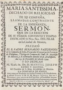 .1755.. FOLLETO: .(SERMON).. .PAZUENGOS, BERNARDO:. .MARIA SANTISSIMA, DECHADO DE RELIGIOSAS DE SU COMPAÑIA, LLAMADAS COMUNMENTE DE LA ENSEÑANZA, SERMON. QUE EN ERECCION DE SU PRIMER CONVENTO Y TEMPLO DEDICADO A Nra. Sra. DEL PILAR EN LA CIUDAD DE...