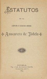 .1899.. FOLLETO: .(NAVARRA-ECONOMÍA).. .ESTATUTOS DE LA COMPAÑÍA Ó SOCIEDAD ANÓNIMA AZUCARERA DE TUDELA.. Tudela: Tip. y Lib. de Antonio Castilla, 1899. 8º mayor. 18 p. Enc. en media piel reciente, con las cubiertas originales. [Más:] .DONOSO,...
