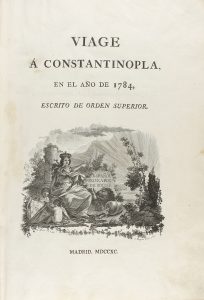 de Europa, África y las islas. Ilustr. con preciosas cabeceras y culs-de-lamp dibujados por Aguado, Velázquez, A. Fernández y grabados por Barcelon y Brieva. Edición realizada sobre grueso papel de hilo. Enc. en la pasta española original, hilos dorados en ambos planos, nervios, tejuelo, cortes pintados, pequeña restauración en la lomera. La obra se publica a partir del manuscrito de Gabriel Aristizabal, comandante de la escuadra que viaja a Constantinopla en misión diplomática, aunque también hay cierto carácter militar y cultural en la empresa encomendada. Es un digno ejemplo de la diplomacia española en el siglo de las luces por establecer lazos con Turquía y sumarse a la tendencia europea de viajes hacia Oriente. Palau 181861.