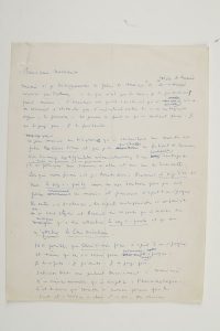Discours de présentation du film Closed Vision de Marc’O au Festival de Cannes de 1954.{CR} Essai symboliste et révolutionnaire, ce premier long-métrage de Marc’O devait, selon Cocteau, sauver le cinéma en produisant un choc sur les spectateurs, guère habitués à ce nouveau type de langage poétique. Il le présenta à Cannes avec Louis Buñuel. Il s’agit ici d’un brouillon du discours, avec ratures et corrections. La version définitive du texte comportera quelques variantes.{CR} « Même si je désapprouvais le film de Marc’O et de Yolande du Luart réalisé par Vickman – ce qui n’est pas le cas – je le présenterais quand même. L’essentiel est qu’il existe et qu’il veuille vivre. On connaît l’obstacle que l’industrialisation du cinématographe à la jeunesse. Un jeune a fait ce qu’il voulait faire. Je ne le juge pas. Je le présente. Un jour Marc’O me téléphona qu’il souhaitait me montrer son film Closed Vision et que je le présentasse au festival de Cannes. […] Lorsque nous fîmes, il y a trente ans, Buñuel L’âge d’Or et moi Le Sang d’un poète, nous ne nous doutions pas que nos films courraient le monde et fixeraient l’esprit d’une époque. En outre, à distance, les esprits antagonistes se confondent en un seul style et Buñuel me raconte qu’il arrive au Mexique qu’on lui attribue Le Sang d’un poète et qu’on m’attribue Le Chien Andalou. Il est possible que Closed Vision fixe l’esprit d’une époque et même qu’on s’en serve pour condamner une époque. […] Salvador Dali me parlait dernièrement à Madrid d’une science nouvelle qu’il baptise : Phoenixologie. C’est la science qui consiste à mourir plusieurs fois de suite et à revivre en chair et en os. On observe ce phénomène dans nos vieux films. On le retrouve dans Closed Vision – ce qui prouverait qu’il existe une tradition de l’avant-garde ou de ce qu’on a coutume d’afficher comme tel. Un jeune homme qui s’exprime avec singularité s’exprime à la minute même où sa révolte l’exige. Être un précurseur est chose impensable (cela reviendrait à se promener avec un parapluie ouvert l’avant-veille d’un orage). Il serait plus juste de constater que les autres retardent sur un acte qui enfonce sa griffe quand il se doit. Marc’O enfonce-t-il sa griffe ? Seule une tireuse de cartes pourrait me répondre »…{CR} On joint une photographie originale de Jean Cocteau avec Marc’O à Cannes en 1954 (par A. Traverso, 13 x 18 cm), et une photographie de Cocteau avec Guy Debord et Marc’O à la villa Santo-Sospir (vers 1951-1952, contretype).