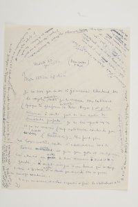Longue lettre sur l’Académie et la candidature de l’historien Jacques Chastenet. De nombreuses incises, fables et commentaires sont ajoutés en marge, ou tête-bêche, tout autour de la lettre.{CR} « Je ne sais pas encore si je recevrai Chastenet sous la coupole académique mais je le recevrai sous la tienne (puisque tu plafonnes sur ma tête au Palais Royal) et je le recevrai à contre poil de mon amour des exactitudes profondes. Je ne lui reproche rien en ce qui me concerne, sauf une dédicace contredite par les textes (son Fallières). Une fois de plus ma longue croisade contre l’intellectualisme dont la France crève est prise pour grâce et sauts périlleux. Ceci entraîne une motte de lieux communs à droite et à gauche […] L’académie m’était le seul lieu d’asile possible. […] Je reproche à ton copain de ne peindre que le dessus. Par contre je préfère les historiens et les ducs et les ambassadeurs au dadais de la littérature contemporaine »… Il note ce quatrain : « Qui chaste naît / Parfois le reste / S’il ne sa veste / Nous retournait. Bref livres trop chastes. Ne pas confondre avec livres trop purs »… Il recommande de ne pas montrer cette lettre : « La bombe de mon journal ne doit éclater qu’après ma mort. La terre est une mauvaise farce et l’espace temps un mensonge dont nous sommes les dupes. Mais si on ne se suicide pas, il faut essayer de prendre cette farce au sérieux. Je cherche autour de moi un homme qui sans être dupe rendrait la justice sous un chêne. Il est probable que les seuls historiens dignes de ce nom en France sont Michelet et Alexandre Dumas »… Etc.