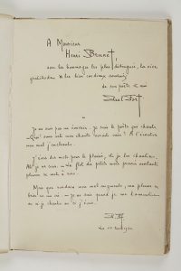 Jolies lettres dans lesquelles il enjoint son ami à souscrire pour ses futures publications L’Amour enfant de Bohème et Contes de ma Sœur l’Oie, avec les deux bulletins de souscription joints. 5 novembre 1929. « Un trouvère auquel vous avez bien voulu témoigner de la sympathie » fait encore appel à lui en ces jours difficiles « fermés aux choses de l’esprit ». Il demande « le logis dans votre bibliothèque pour ce livre : L’Amour enfant de Bohème, livre de bonne humeur (dû cependant à la misère du temps), où le poète a mis le brin de talent qu’on lui prête »... 4 septembre 1931. « Du monde voltigeant des fées, du château de Richard-Cœur –de-Lion, des jardins de Sâadi, du couvent de François d’Assise, enfin des auberges du vieux Paris [...] vient à vous le souhait d’un trouvère qui les chanta, que vous avez encouragé de votre estime, [...] auteur de ces Contes de ma Sœur l’Oie [...]qui bientôt vont paraître »... – L’Amour Enfant de Bohème (Typographie Armand Jules Klein, Paris 1930, tirage nominatif hors librairie n°42 sur 200, « sur vergé d’Arches à la forme, contresignés par l’auteur et accompagnés d’une dédicace et d’une page manuscrite », impr. au nom de Henri Brunet ; bandeaux et culs de lampe de Gino Severini, portrait par Zuloaga en frontispice) avec dédicace a.s. à Henri Brunet, et poème (3 versets) : « Je ne suis pas un écrivain. Je suis le poète qui chante »... (1er avril 1930). On joint les Chants du malheur et Chansons du bonheur (Armand Jules Klein 1935, exemplaire n°38 signé par Paul Fort) ; plus divers documents de Paul Fort, et 2 documents anciens sur vélin (Rouen 1564, 1658).