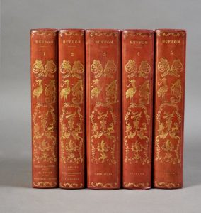 BUFFON. Oeuvres complètes, suivies de la classification comparée de Cuvier, Lesson... Paris, Pourrat frères, 1837. 5 volumes grd in-8, demi-veau glacé cerise, dos ornés et dor de fers animaliers (Reliure de l'époque).