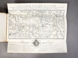 Recueil comprenant: I. Une grande carte repliée d'une partie de la Flandre datée 1726 et 68 ff manuscrits. II.- Harangue faite au roi, à Fontainebleau le 20. Octobre 1725 par Monseigneur l'Evêque duc de Langres. Paris, Simon, 1725. III- Motifs des résolutions du roy.- Paralelle de l'élection à la couronne de Pologne, faite en faveur du Sérenissime Stanislas Leszczynski, et du Sérenissime Fréderic auguste, électeur de Saxe.- IV.- Ordonnance du roy portant declaration de guerre contre l'Empereur du 10 octobre 1733. V.- Relation de la grande victoire remportée par le grand seigneur contre les persans. Mandement replié. In-4 veau fauve, dos à nerfs orné et dor. (Reliure de l'époque un peu fatiguée).