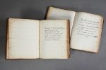 MILITARIA.- MANUSCRIT du XVIIIe siècle en 2 parties, intitulé «Receüil de mes campaignes depuis 1697 depuis mil six cent quatre vingt dix sept jusques à l'année mil sept cent huict avec des remarques tirées de divers autheurs» pour le premier volume et «Recueil de mes campaignes depuis mil sept cent neuf jusques à la paix generalle mil sept cent quatorze avec des remarques sur les années suivantes jusques a la fin de sept 1719» pour le second. 2 vol. in-4, veau brun de 154 ff numérotés pour le premier tome et 137 ff numérotés pour le second, dos à nerfs ornés et dor. (Reliure de l'époque un peu usagée).