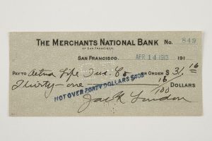 Jack London (1876-1916). P.S. avec 2 lignes autographes, San Francisco 14 avril 1913 ; 1 page obl. in-12.