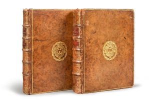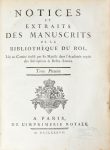 RELIURE AUX ARMES.- Notices et extraits des manuscrits de la bibliothèque du roi, lûs au Comité établi par sa Majesté dans l'Académie royale des Inscriptions et Belles-Lettres. Paris, de l'Imprimerie royale, 1787 et 1789; 2 vol. in-4 veau blond marbré, pièces de titre sur les dos à nerfs ornés et dor. du monogramme couronné royal, cadre de fil. dor. avec armes royales frappées en or au centre des plats, tr. mouchetées rouges (Reliure de l'époque).