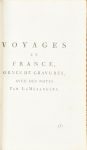 VOYAGES EN FRANCE. Paris, imprimerie de Chaignieau aîné, an IV- an VI [1796-1798]; 4 volumes in-18, mar. rouge à grain long, titre et tomaison sur les dos ornés et finement dor., dent. et guirlande dor. encadrant les plats, dent. int. dor., doublé et gardes de tabis bleu, tr. dor. (Reliure de l'époque).
