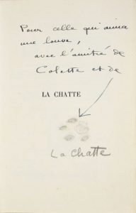 Exemplaire sur Alfa. Envoi autographe à l'encre gris-bleu et au crayon avec petit dessin au crayon représentant une trace de patte féline: «Pour celle qui aima une louve, avec l'amitié de Colette et de La Chatte».