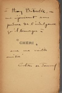 Chéri. Paris, Fayard. Ex. non numéroté avec un envoi signé Colette de Jouvenel à Henry Bataille. Ex. usagé.