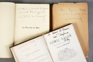 Héliogravure d'après Jacques Blanche. Paris, Mercure de France. 1905. Edit. en partie originale. Ex. num. sur papier d'édition. Envoi autographe signé «Colette Willy» à Suzanne Després (brochage fatigué).- la paix chez les bêtes. Frontispice de Steinlen. Crès, 1916. Envoi autographe à Madame Camille Du Gast signé Colette de Jouvenel.- Chats de Colette. Editions Albin Michel.- WILLY. Comic- salon. Dessins de Christophe. Vanier, 1892. In-12 Bradel cart. Envoi signé de Willy à Ch. Bonnier. Ens. 4 vol.