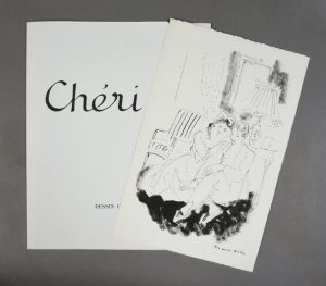 Chéri. Paris, Editions Vialetay, 1952. in-8, en ff sous couverture d'Auvergne rempliée et imprimée en mauve, chemise et étui cartonnés et illustrés en vieux rose. 30 pointes-sèches originales en noir in-texte. Un des 20 ex. numérotés sur Rives avec un dessin original, un bon à tirer d'état, une suite avec remarques sur Johannot. Cet exemplaire est signé par l'auteur et par l'artiste à l'encre au colophon (seuls les 100 premiers ont été signés de Colette). Etui légèrement jauni.