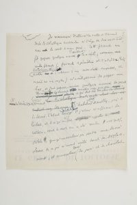 Manuscrit de travail, présentant d’abondantes ratures et corrections, et une pagination non continue (1-8, une non chiffrée, 13-17). Cet essai, recueilli dans Le Fichier parisien (1974), se compose de souvenirs nostalgiques de la Salle Labrouste à la Bibliothèque Nationale : son public hétéroclite, la « puanteur de l’intelligence », les in-folios, les fraudes aux cartes, quelques lecteurs de marque : Bergson, Halévy, Bourges… Anecdote personnelle : un gardien, « gazé de guerre quatre vingts pour cent », le surprend allumant une cigarette dans la cour… Les dernières lignes manquent, complétées par le texte imprimé collé.