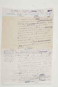 Henry de montherlant. Manuscrit autographe, En marge de “La Guerre civile”, [1965] ; 1 page grand in-fol. avec ratures et corrections, au dos de fragments de circulaires ronéotées.