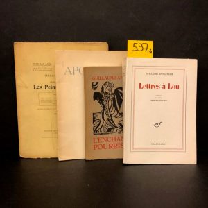 Lettres à Lou. Préface et notes de M. Décaudin. P., Gallimard, 1969, fort 8°, br., couv. rempliée. Édit. orig. tirée à 138 ex. num. 1/109 vélin pur fil Lafuma-Navarre, 2e papier après 29 Hollande. Bel exemplaire./ IDEM. Inédits. Brux., Un coups de dés, 1948, plaquette 8°, br., couv. rempliée (couv. lég. jaunie, intérieur très lég. piqué). Édit. tirée à 30 ex. num. 1/27 hors commerce sur vergé de Hollande, seul papier après 3 Japon./ IDEM. Les Peintres cubistes (méditations esthétiques). P., Figuière, 1913, 8°, br. (dos fendu, couv. abîmée, rousseurs éparses)./ IDEM. L'Enchanteur pourrissant. Édition nouvelle illustrée de reproductions des bois gravés pour l'édition originale par André Derain. P., Éditions de la Nouvelle Revue française, 1921, 8°, br. (petites taches et manque au 2e plat)./ 4 vol.