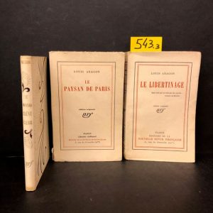 Le Paysan de Paris. P., NRF, 1926, 8°, br. (queue de dos lég. abîmée, quelques pâles rousseurs en tête et fin de vol.). Edit. orig. tirée à 1053 ex. num. 1/900 vélin pur fil./ IDEM. Le Nouveau Crève-coeur. Même édit., 1948, 8°, cart. édit. orné d'après la maquette de Paul Bonet. Edit. orig. tirée à 1109 ex. num. 1/1040 sur alfa (Huret, 27)./ IDEM. Le Libertinage. Même édit., 1924, 8°, br. (dos partiellement abîmé). Edit. orig. tirée à 1000 ex. num. 1/792 sur vélin pur fil./ Ens. 3 vol.