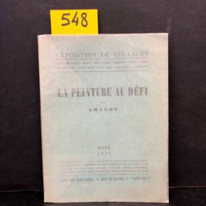 La Peinture au défi. P., Galerie Goemans (étiquette de relais : Librairie José Corti), mars 1930, petit 8°, 32 p., br. Comprend 23 reproductions de papiers collés et collages réparties sur 12 planches hors texte sur papier couché. Oeuvres de Arp, Braque, Dali, Derain, Duchamp, Ernst, Lissitsky, Magritte, Man Ray, Miro, Picabia, Picasso, Rodtchenko, Tanguy. Edit. orig. tirée à 1020 ex. 1/1000 alfa non num. Cet important texte manifeste fut écrit à l'occasion de l'exposition de collages organisée en mars 1930 à la galerie Goemans à Paris. Aragon fut probablement le premier à avoir analysé le principe du collage dans le domaine des arts plastiques. Bel exemplaire.