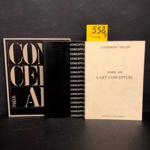 MILLET (Catherine). Textes sur l'art conceptuel. P., Daniel Templon, 1972, petit 8°, br. (annotations au crayon). Edit. orig./ MEYER (U.). Conceptual Art. N.Y., Dutton, 1972, petit 8°, br. Edit. orig./ HONNEF (K.). Concept Art. Cologne, Phaidon, 1971, petit 8°, 192 p., br./ Ens. 3 vol.