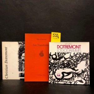 Les Transformes. P., Yves Rivière, 1972, 1 cahier en fac-similé de 6 doubles pages non chiffrées dont 1 de couverture ornée en couleurs sur papier teinté gris, en feuilles, étui édit. de toile orange. Edit. orig. de ce recueil "Cobra" avec une préface d'Alechinsky. Il fut composé en 1950 dans l'atelier même d'Alechinsky conjointement par Atlan et Dotremont. Tirage limité à 600 ex. num./ LOREAU (Max). Dotremont. Logogrammes. P., Fall, 1975, 8° carré, br. Joint : 1 biographie de l'artiste, dactylographiée./ Dotremont. Copenhagen, Borgen, 1982, 8° oblong, br. Tirage limité à 400 ex. num./ Ens. 3 vol.